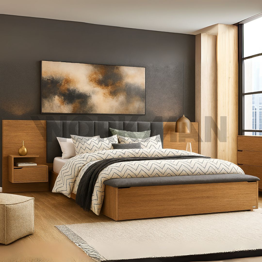 Bed+2 Nightstands (Errol)Size: King SizeMaterials and Features:-High End MFM Structure-Upholstered panels for comfortable head rest-High quality Soft closing drawersFinish as per customer drawing