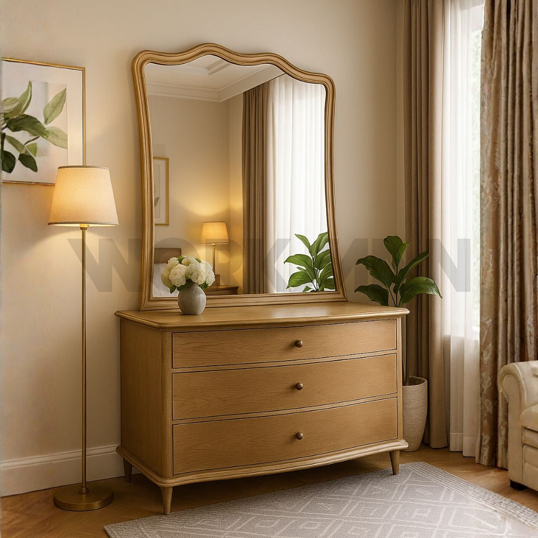 Dresser + Mirror (Eden)Size: 4' LengthMaterials and Features:-Solid Veneer Structure-Hand crafted brushed polish finish-Imported high quality soft closing drawers